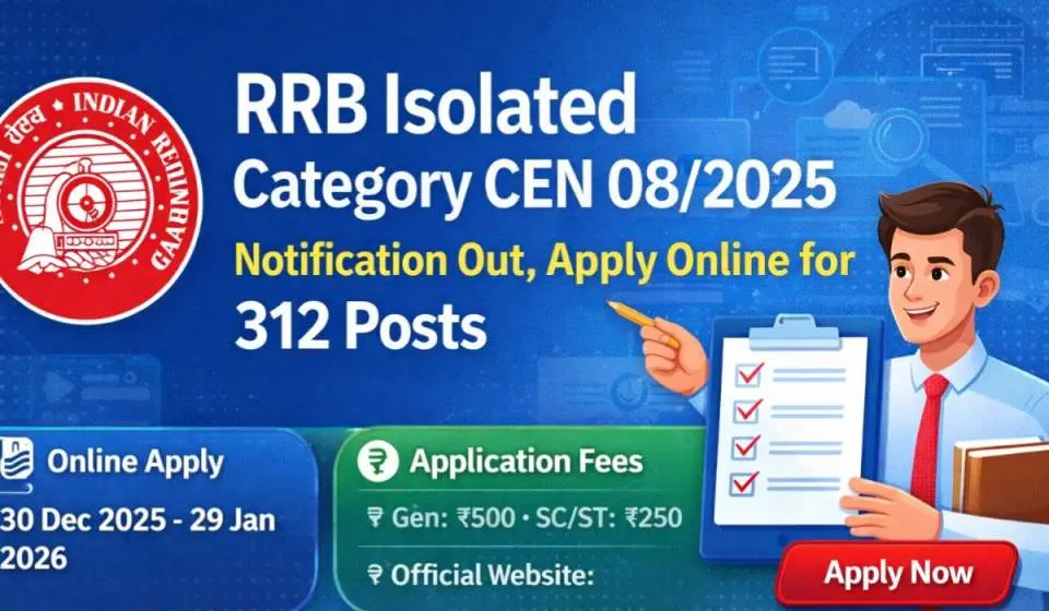 The Railway Recruitment Board (RRB) has officially released the RRB Isolated Category CEN 08/2025 Notification for recruitment to various Isolated Category posts in Indian Railways. A total of 312 vacancies have been announced.