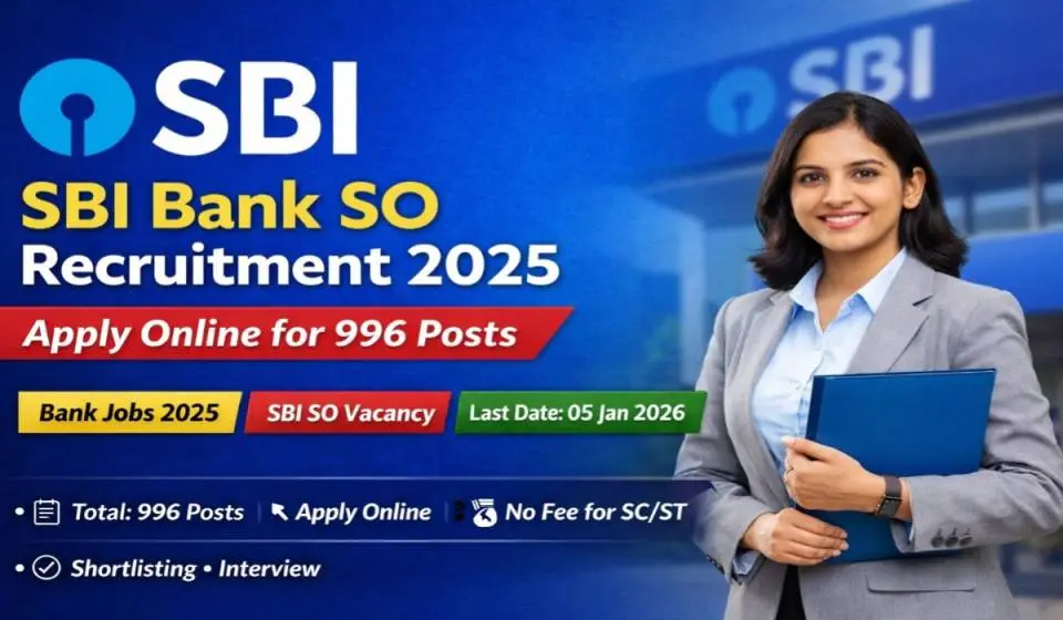 SBI Bank SO Recruitment 2025 notification has been officially released by the State Bank of India (SBI) for the recruitment of Specialist Officer (SO) posts. A total of 996 vacancies have been announced under this recruitment drive. This is a golden opportunity for candidates looking for a prestigious Bank Job in 2025.